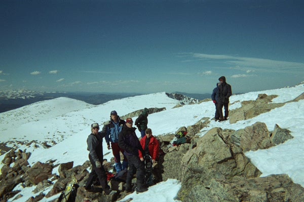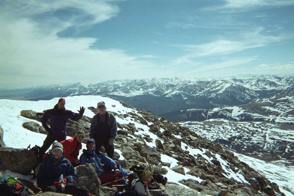 beergang1.jpg I have affectionately started calling these guys the Bierstadt gang. They started just after us and finished just before us, primarily (in my humble opinion) since they all had snow shoes. In the background behind them is Jen. Shanon and Aleshia are off to the right. beergang2.jpg From left to right is Doug in the red cap, Derby with the suspenders, and Alie in the red jacket, and Glen in the blue jacket. In the background, you can see the valley that we all trudged through. beergang3.jpg Here they are again with Jen in the forground, and a South-Westward backdrop. Thanks again for the food! Mmmm Tootsie Rolls! Mmmm Cashews! Definetly worth the price of a few photos (They forgot their camera and I didn't bring enough lunch).