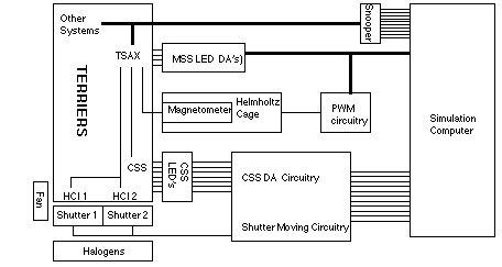 For each of the primary sensors, physical stimulation, controlled by the simulation computer, is provided. For the MSS, a secondary or backup ACS system, the sensors are bypassed and the sensor AD board (TSAX) is stimulated directly. Communication between the MSS and magnetometer stimulators and the simulation computer is done over a common AUX bus (isolated from the spacecraft AUX bus). However, for the HCI and CSS, a parallel bus is used with each bit corresponding to a specific action.